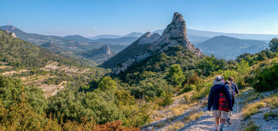 This area, to the east of Avignon, is full of extraordinary geological features. At the centre lies ‘le Mont Ventoux’ (the windy mountain), well known to cyclists and spectators of the Tour de France. While the view of its lonely summit is often on the horizon, our walks wind through its greener foothills.